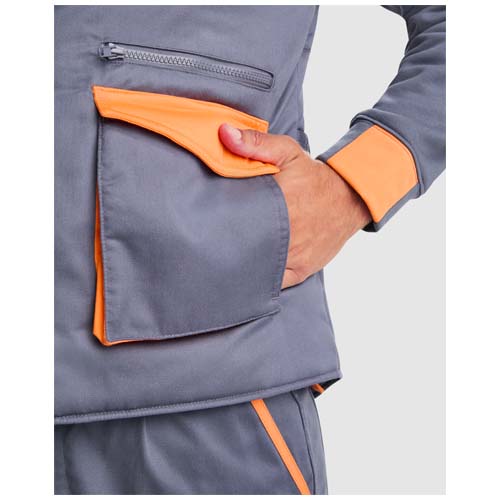 Kamizelka robocza z wieloma kieszeniami, w dwukolorowej kombinacji, z wysokim kołnierzem. Zamek błyskawiczny z przodu z zapięciem na rzep. Mankiety nieprzepuszczające wiatru. Zewnętrzna kieszeń na telefon z prawej strony, z klapką i zapięciem na rzep. Dwie przednie kieszenie z plisami, zapinane na rzep. Dwie kieszenie na długopisy. Wewnętrzna kieszeń z zapięciem na rzep. Kieszeń zapinana na zamek błyskawiczny. Dłuższy tył. Automatyczny regulator. Kontrastujące elementy na ramio