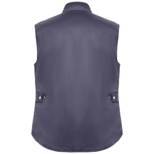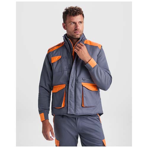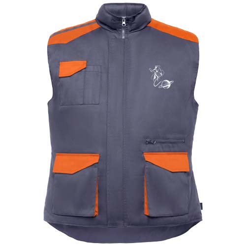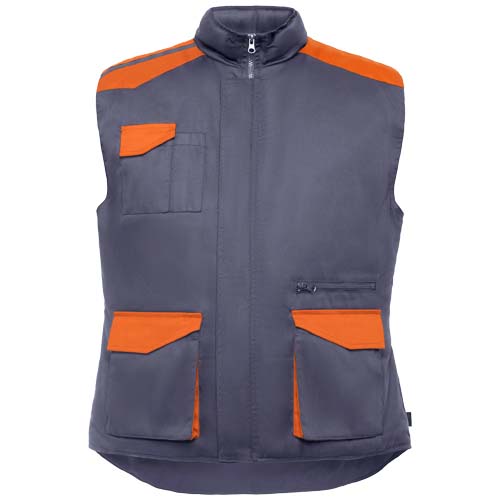 Kamizelka robocza z wieloma kieszeniami, w dwukolorowej kombinacji, z wysokim kołnierzem. Zamek błyskawiczny z przodu z zapięciem na rzep. Mankiety nieprzepuszczające wiatru. Zewnętrzna kieszeń na telefon z prawej strony, z klapką i zapięciem na rzep. Dwie przednie kieszenie z plisami, zapinane na rzep. Dwie kieszenie na długopisy. Wewnętrzna kieszeń z zapięciem na rzep. Kieszeń zapinana na zamek błyskawiczny. Dłuższy tył. Automatyczny regulator. Kontrastujące elementy na ramio