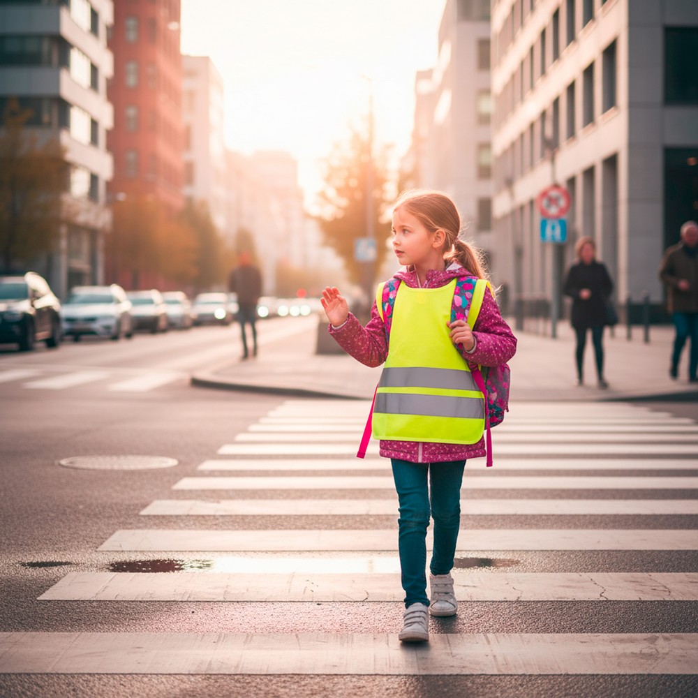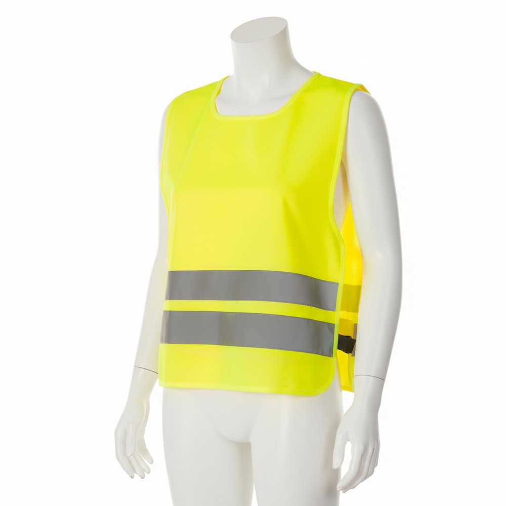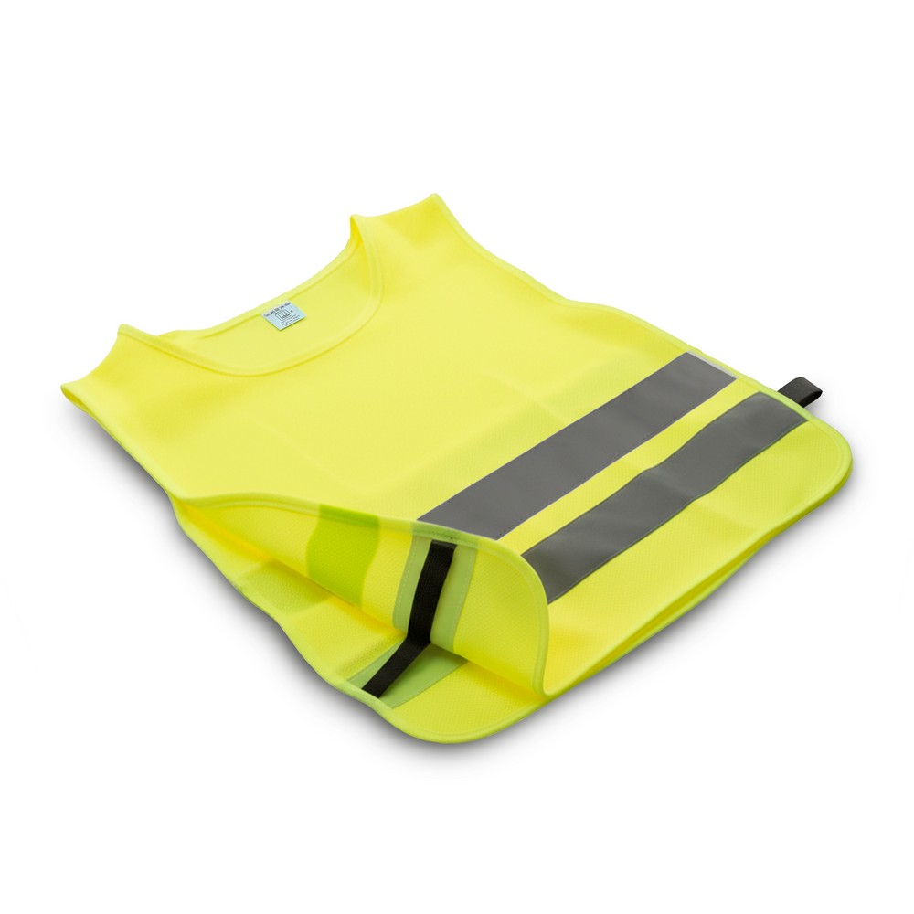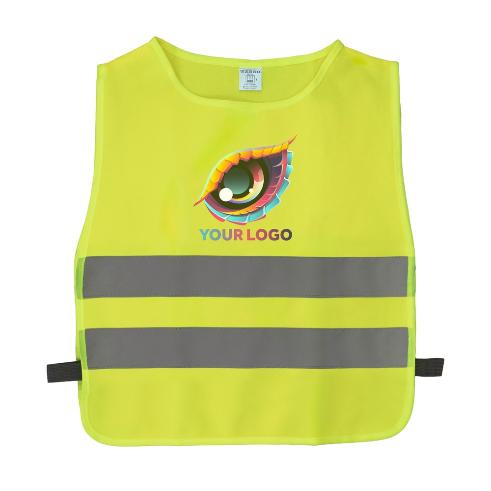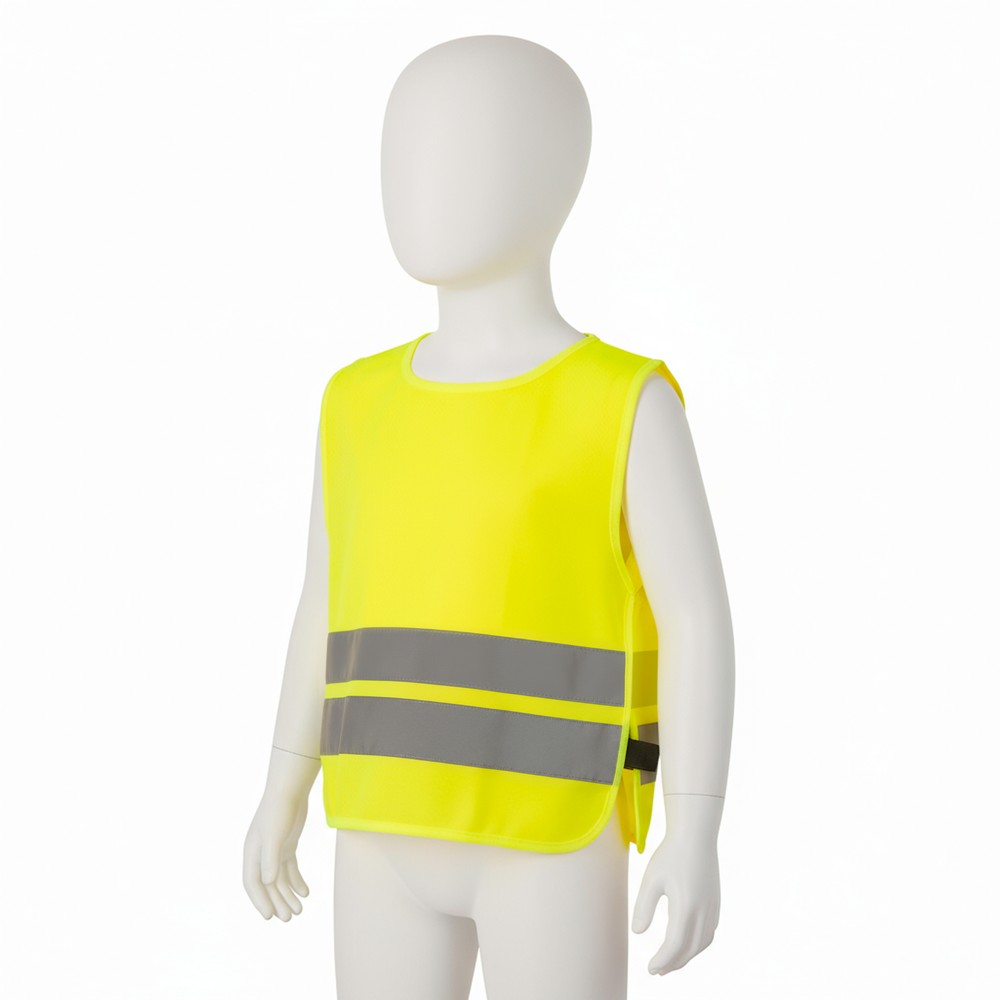 Kamizelka dziecięca odblaskowa, posiada po dwa paski odblaskowe z przodu i z tyłu, certyfikowana zgodnie z EN17353