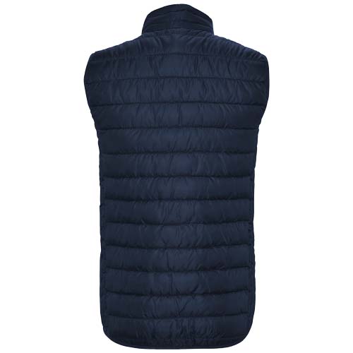 Gilet vest with feather touch filling. Inverted zips with matching chin protector and puller. Two side pockets with zip. Elastic trim in hem and armholes. Contrasting inner lining. Light and foldable garment. Water resistant. Wind-proof model.
