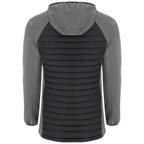 Męska kurtka z kombinacji dwóch materiałów: Regulowany kaptur. Raglanowe rękawy. Rękawy, panele boczne i kaptur z materiału softshell. Pikowany materiał przypominający w dotyku pierze z przodu i z tyłu. Odwrócony zamek błyskawiczny z pasującym ochraniaczem podbródka i ściągaczem. Dwie przednie kieszenie z zamkami błyskawicznymi. Dopasowane elastyczne wykończenie kołnierza, mankietów i dołu bluzy. Usuwalna metka. Model wiatroszczelny.