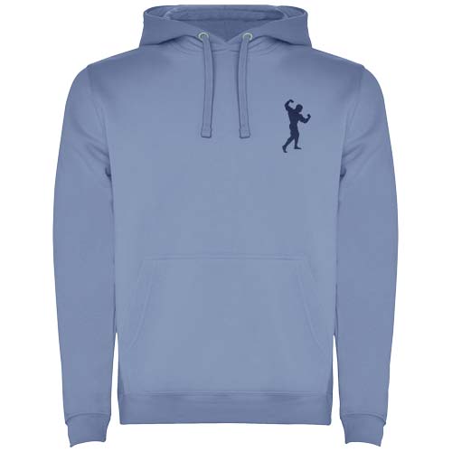 Dwukolorowa bluza z kapturem z podwójnego materiału, kontrastowym regulowanym sznurkiem, wzmocnionymi krytymi szwami w kołnierzu i kieszenią typu kangurka. Ściągacze 1x1 z elastanu w mankietach i pasie. Usuwalna metka.