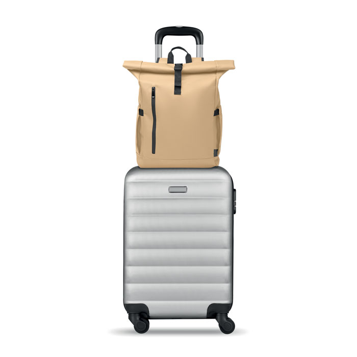 Plecak na laptop typu rolltop z powlekanego PU poliestru 600D RPET i podszewką z poliestru RPET. Wyściełane plecy z kieszenią na zamek i paskiem na walizkę. Wyściełany pasek na ramię z wewnętrznym wykończeniem z siatki.