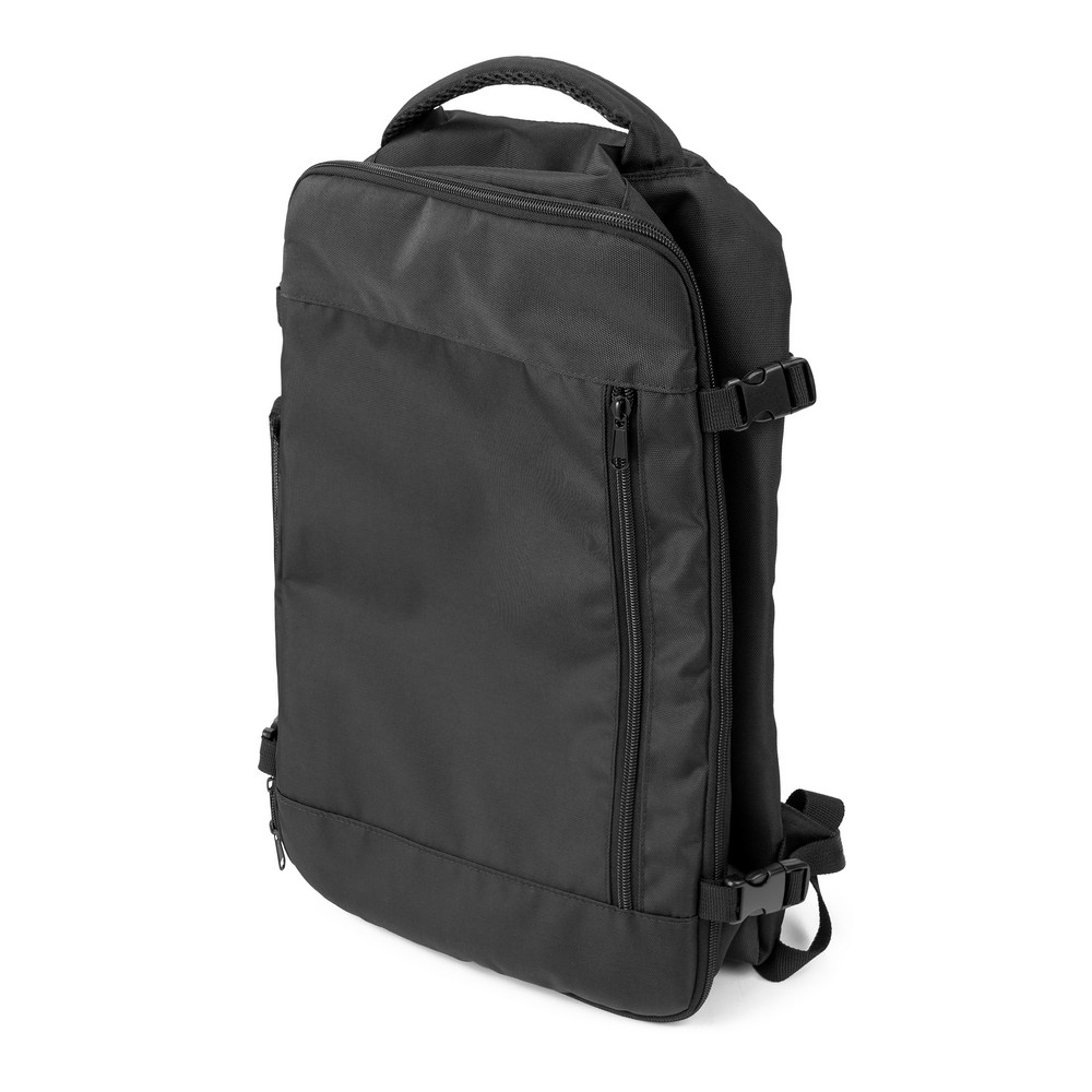 Plecak podróżny w formie bagażu osobistego, kabinowy, przeznaczony do umieszczenia pod siedzeniem w samolocie, pojemność 20L, jedna przegroda główna zamykana na zamek błyskawiczny, wewnątrz kieszeń z siatki zamykana na zamek, na zewnątrz dwie kieszenie zamykane na zamek oraz kieszeń na butelkę, dwa regulowane paski kompresyjne ułatwiają stabilizację plecaka, na plecach pas umożliwiający zaczepienie o rączkę walizki, miękkie i regulowane paski na ramię umożliwiają dopasowa