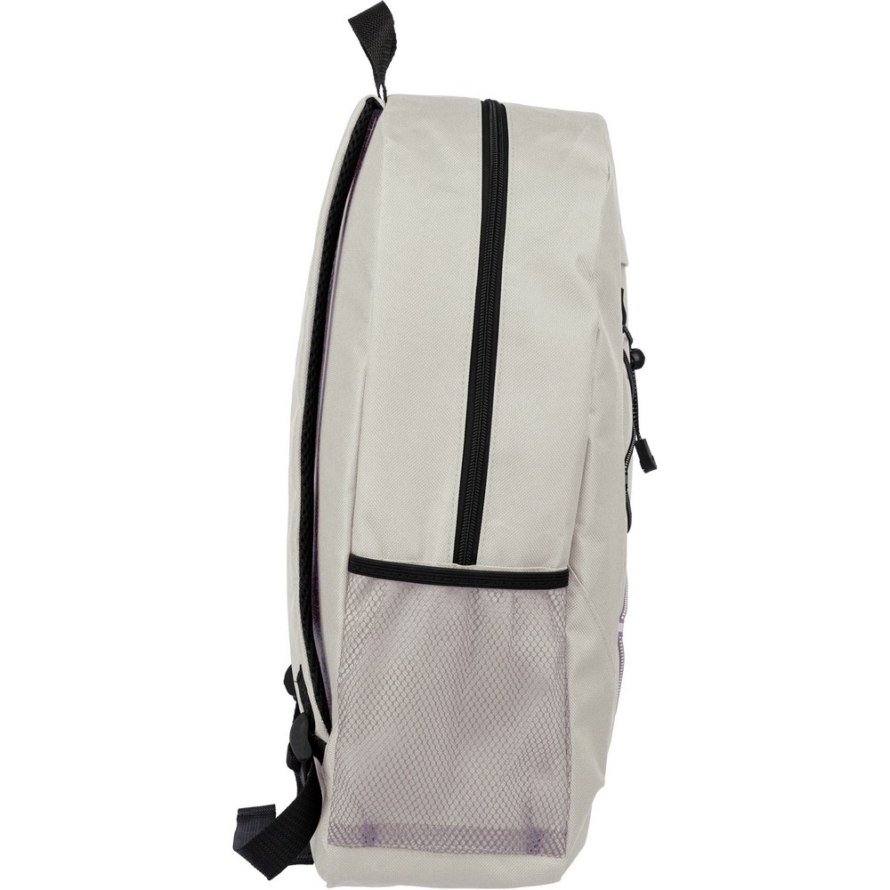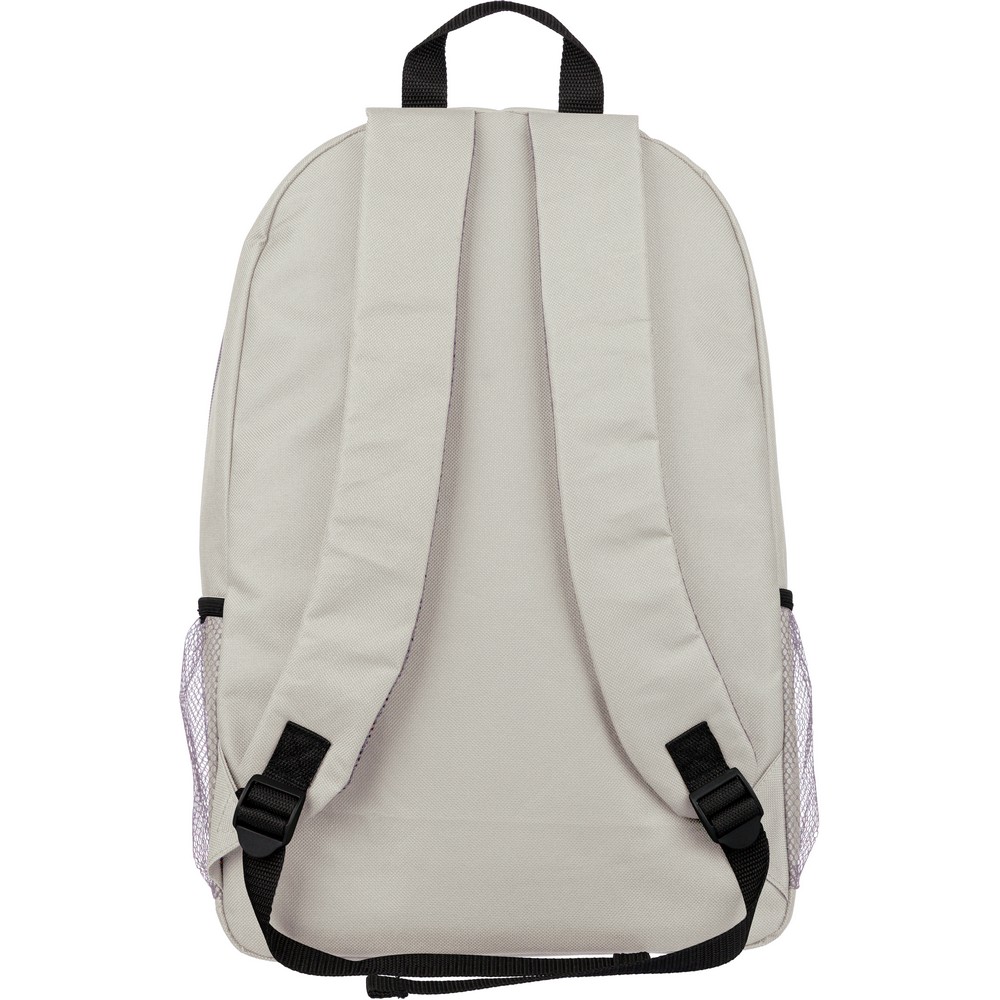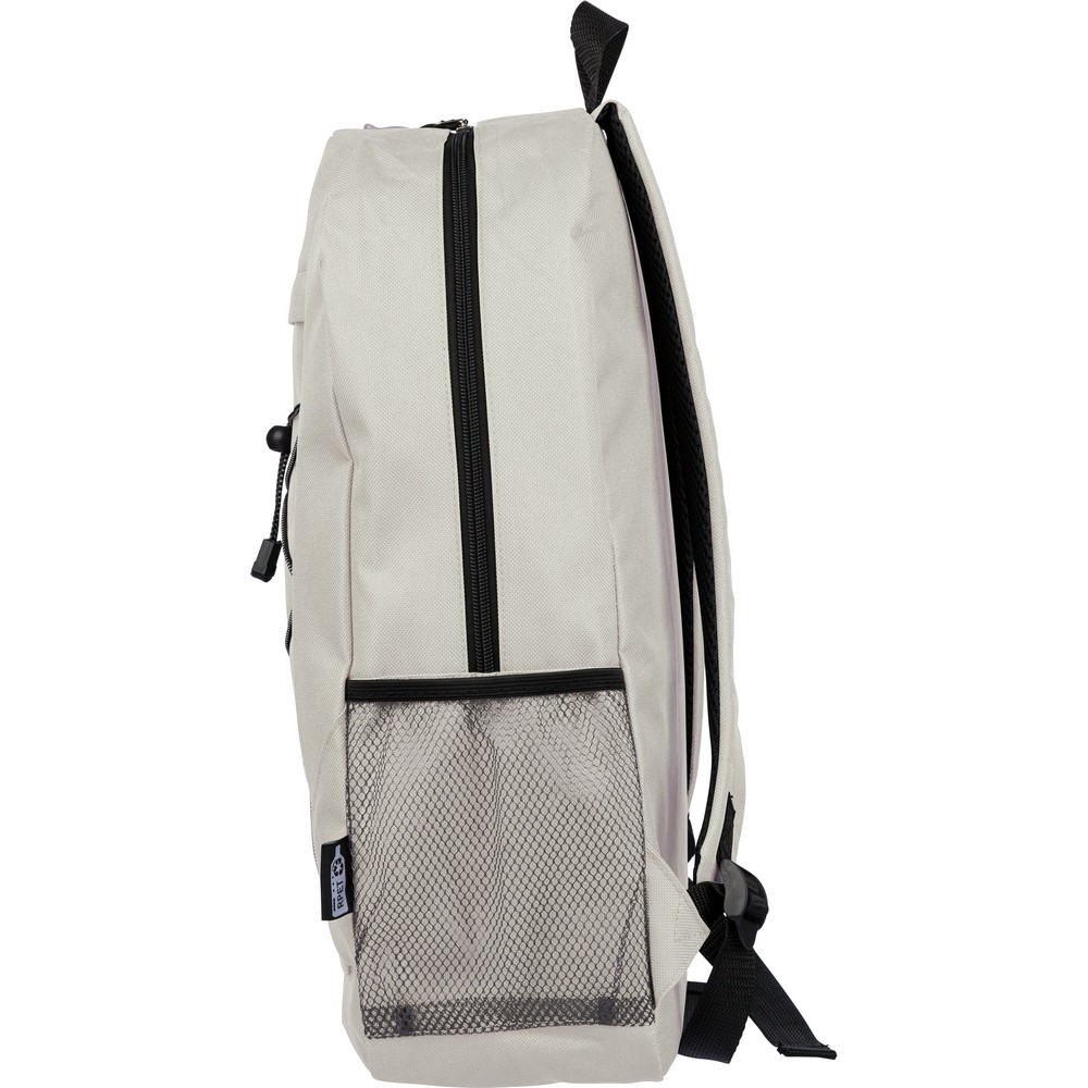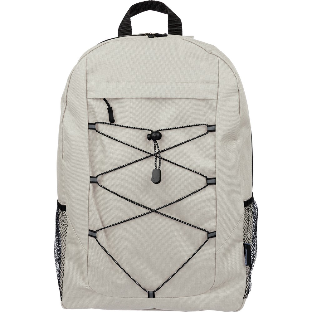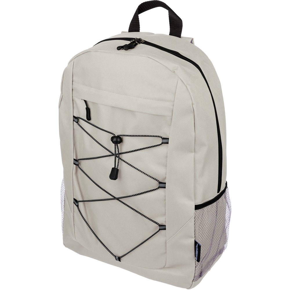 Plecak podróżny, siatkowate kieszenie po obu stronach, elastyczne sznurki z przodu do przymocowania butelki albo koca, zaciskane zamknięcie, mała kieszeń zapinana na zamek z przodu, kieszeń główna zapinana na zamek, ikona RPET na metce, produkt wykonany z RPET, poliestru i elastanu