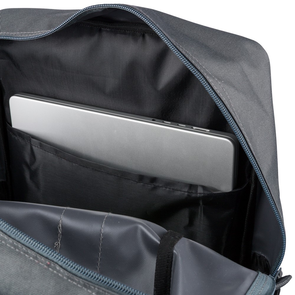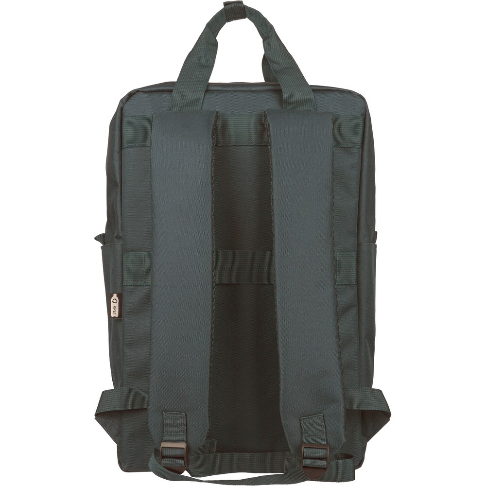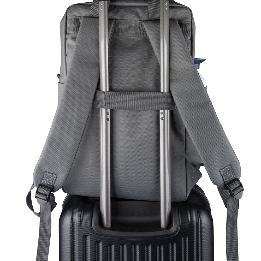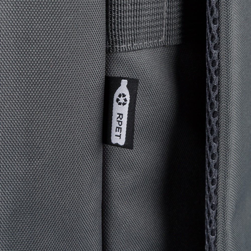 Plecak, podszewka z poliestru 210D, główna kieszeń zapinana na zamek, wewnętrzna przegroda na laptopa 16", mniejsza przednia kieszeń zapinana na zamek, regulowane i wentylowane paski do noszenia, pasek do przymocowania do walizki, kieszenie boczne po obu stronach, produkt wykonany z poliestru 600D z recyklingu