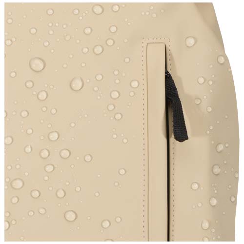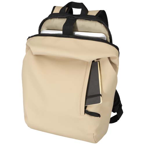 Plecak na laptop 15-calowy wykonany z najwyższej jakości skóry poliuretanowej (PU) z certyfikatem GRS pochodzącej z recyklingu, z podszewką z tworzywa RPET w dopasowanym kolorze, z zabezpieczeniem antykradzieżowym zapewniający ochronę i suchość Twoich rzeczy w podróży. Ma tylną przegrodę na laptopa, dwie opływowe kieszenie boczne i przednią kieszeń zapinaną na suwak z wodoodpornym zamkiem. Oddychający tylny panel gwarantuje całodzienny komfort, dzięki czemu plecak idealnie n