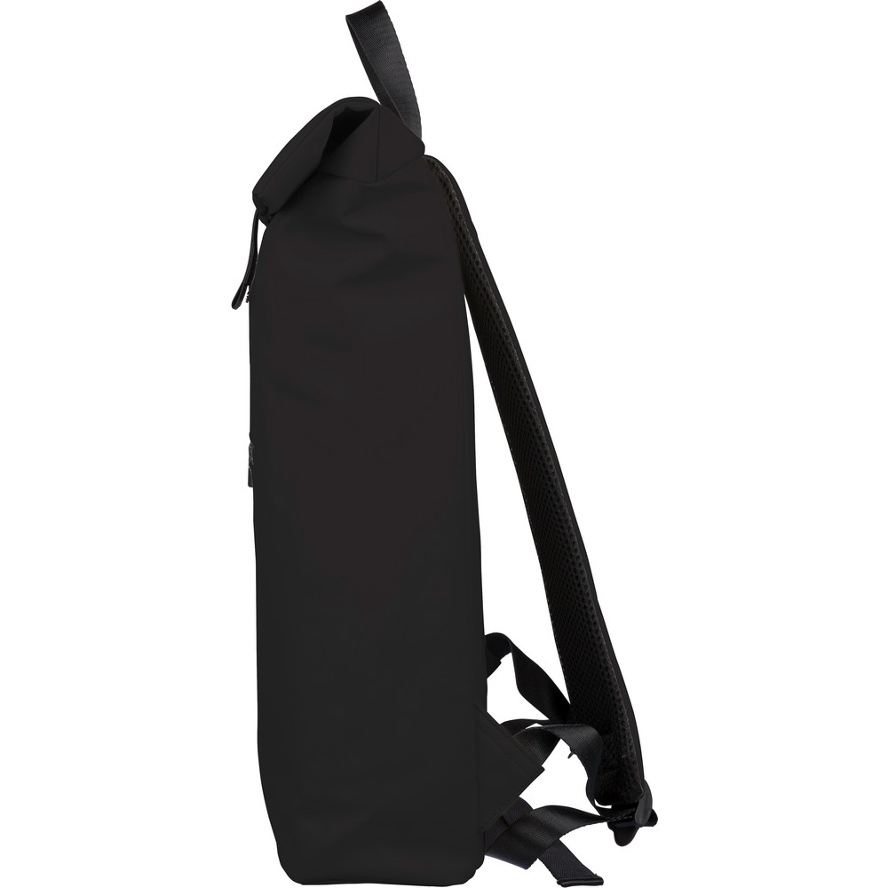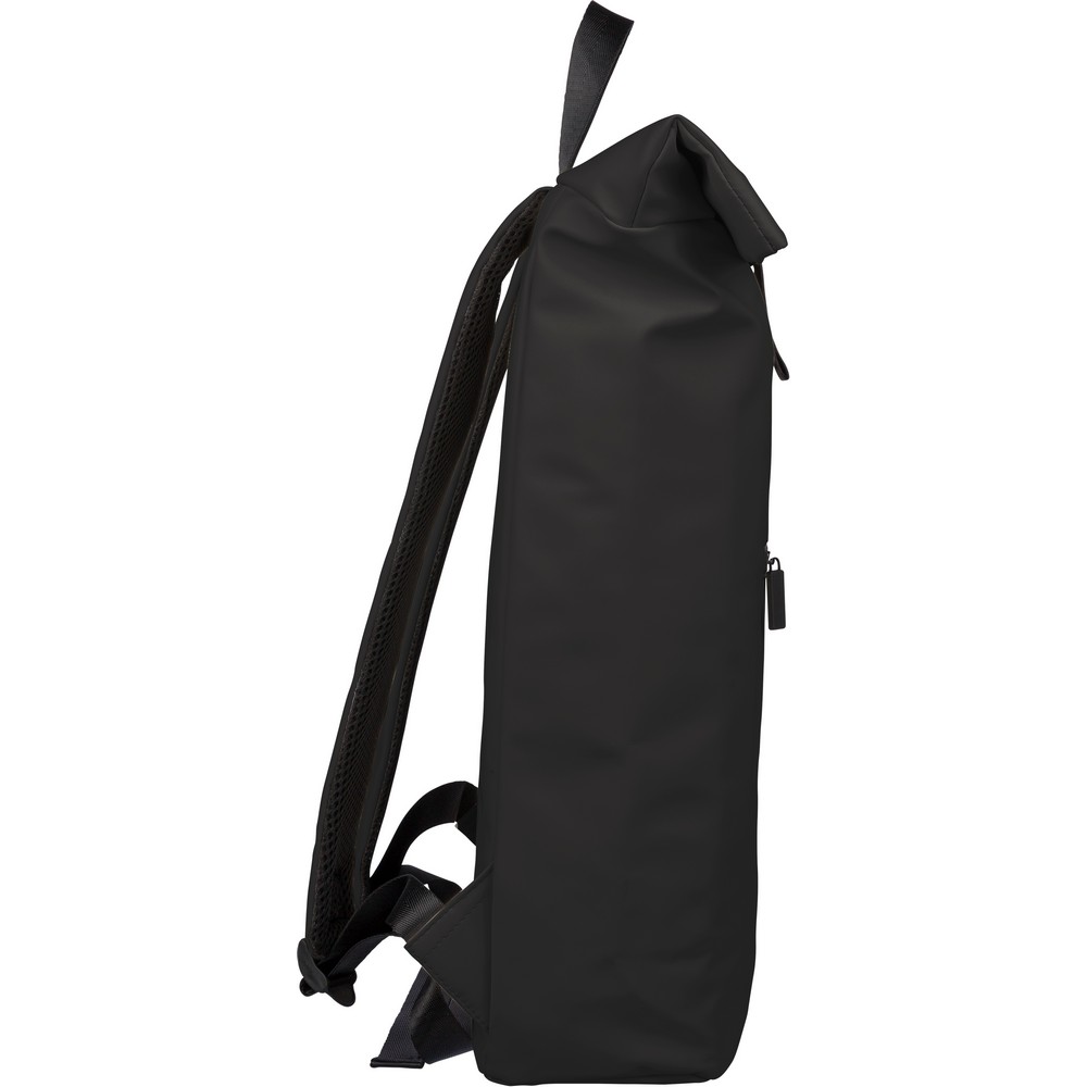 Zwijany plecak o pojemności 19 litrów, mała kieszeń zapinana na zamek z przodu, zwijana główna kieszeń zamykana na rzep, przegroda na laptopa 16" w środku, regulowane wentylowane paski na ramię, uchwyt z wierzchu ułatwiający noszenie, podszewka z poliestru 210D, ikona recyklingu na metce, produkt wykonany z PU z recyklingu i poliestru