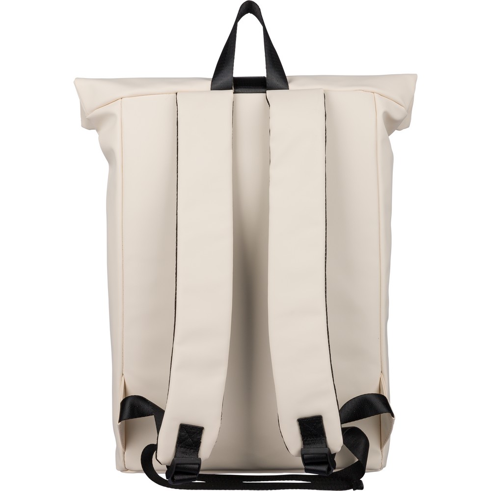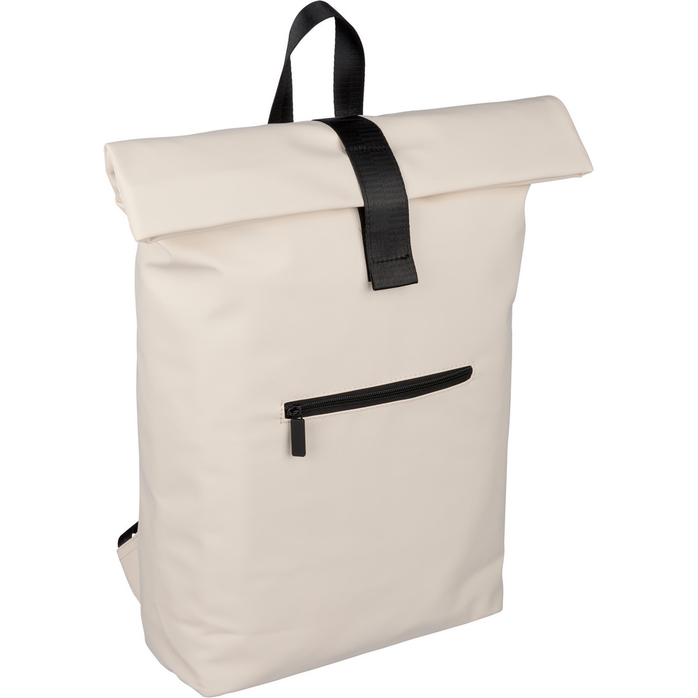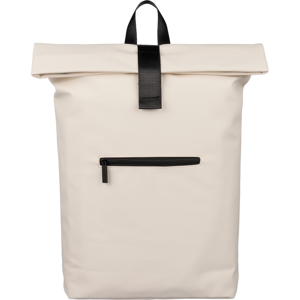 Zwijany plecak o pojemności 19 litrów, mała kieszeń zapinana na zamek z przodu, zwijana główna kieszeń zamykana na rzep, przegroda na laptopa 16" w środku, regulowane wentylowane paski na ramię, uchwyt z wierzchu ułatwiający noszenie, podszewka z poliestru 210D, ikona recyklingu na metce, produkt wykonany z PU z recyklingu i poliestru