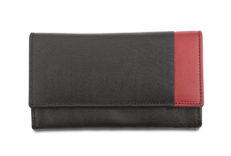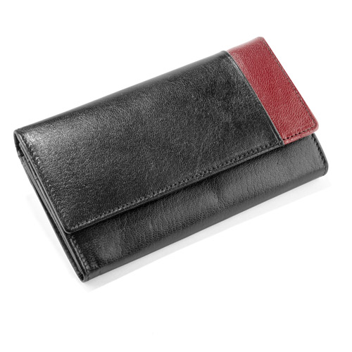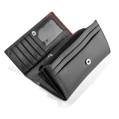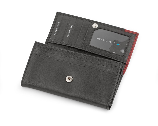 Portfel wykonany ze skóry naturalnej. Klasyczny wzór przełamany wstawką w innym kolorze sprawia, że portfel jest ciekawy i unikatowy. Posiada zewnętrzną kieszeń zamykaną na zamek. Wewnątrz znajduje się 5 zakładek na karty kredytowe, 5 przegródek na dokumenty oraz kieszonka zapinana na zamek.