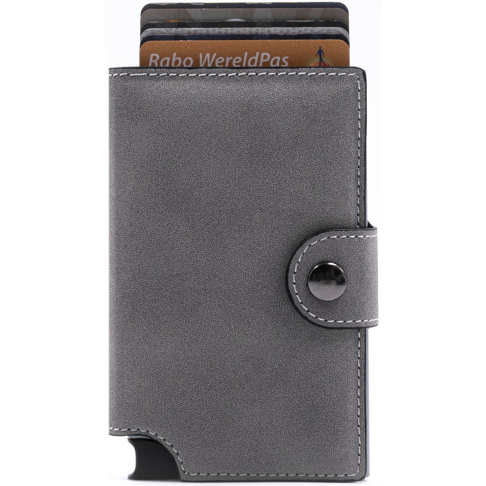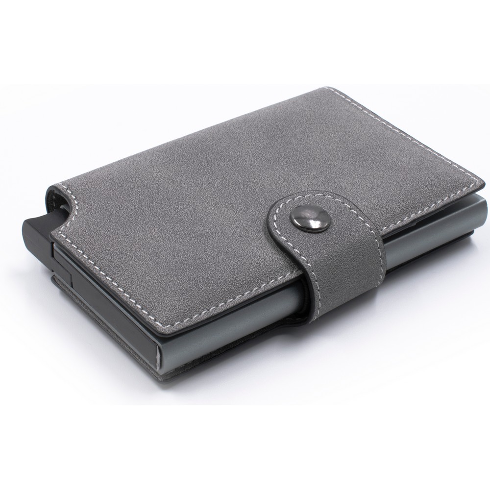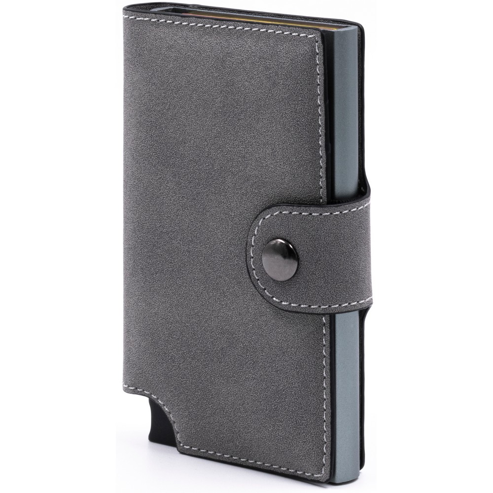 Portfel BrandCharger Wally Porto, przeznaczony do bezpiecznego przechowywania do 9 kart, z ochroną RFID, która zwiększa bezpieczeństwo danych, wykonany z podkładki zapobiegającej zginaniu się i łamaniu, zmieści się w każdej kieszeni, mechanizm wysuwający kartę z portfela, zapakowany w ozdobne pudełko kartonowe, produkt wykonany z aluminium i PU
