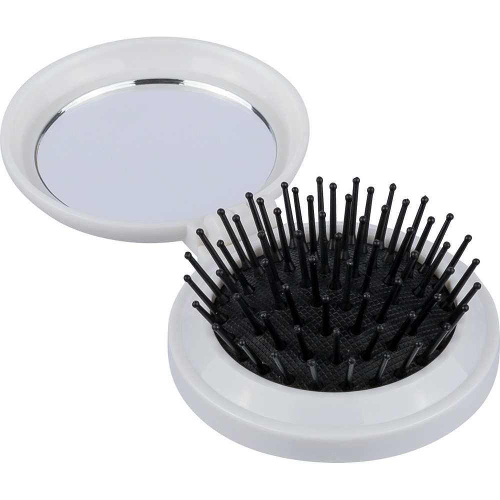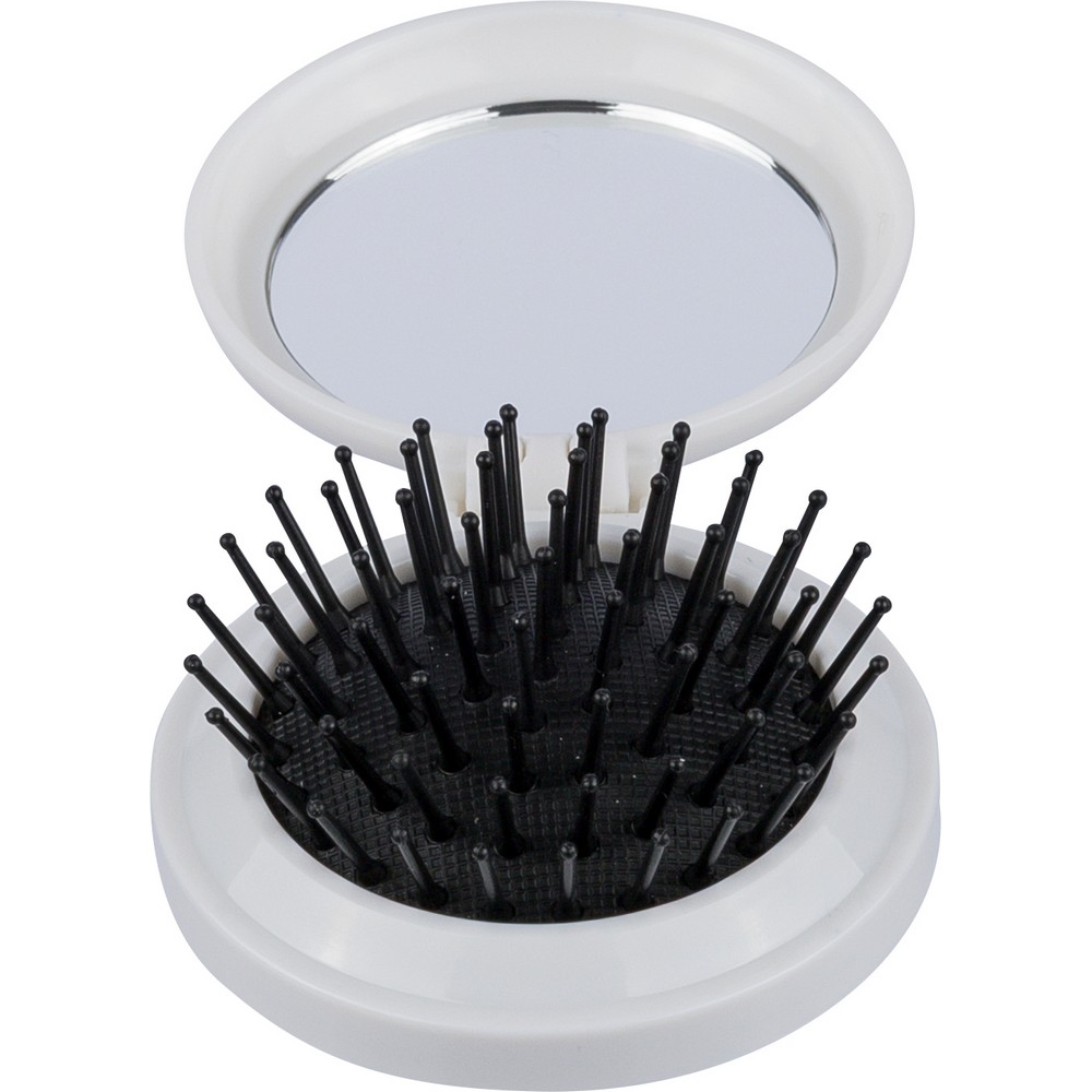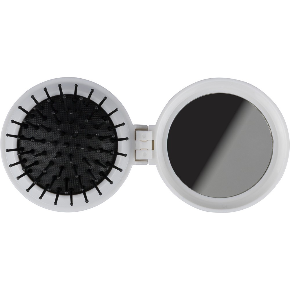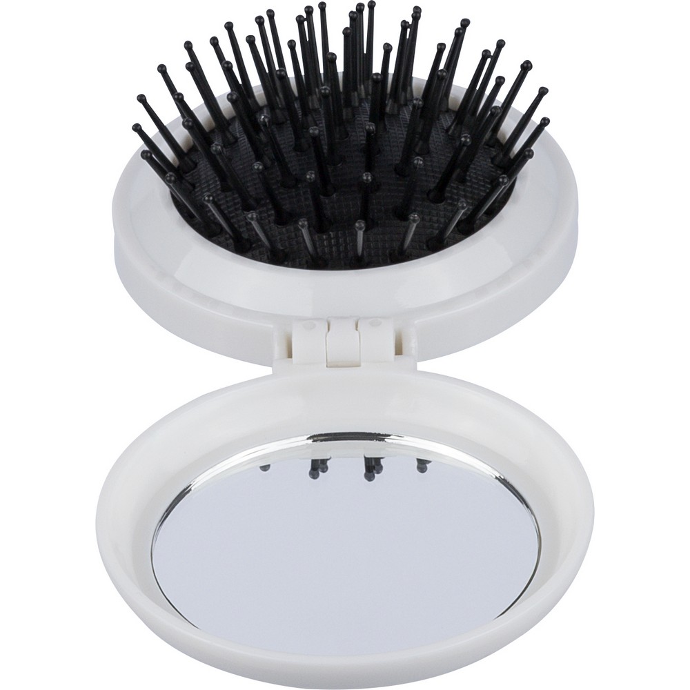 Szczotka do włosów, lusterko, ikona recyklingu na produkcie, zapakowany w woreczek foliowy z recyklingu, produkt wykonany z ABS z recyklingu