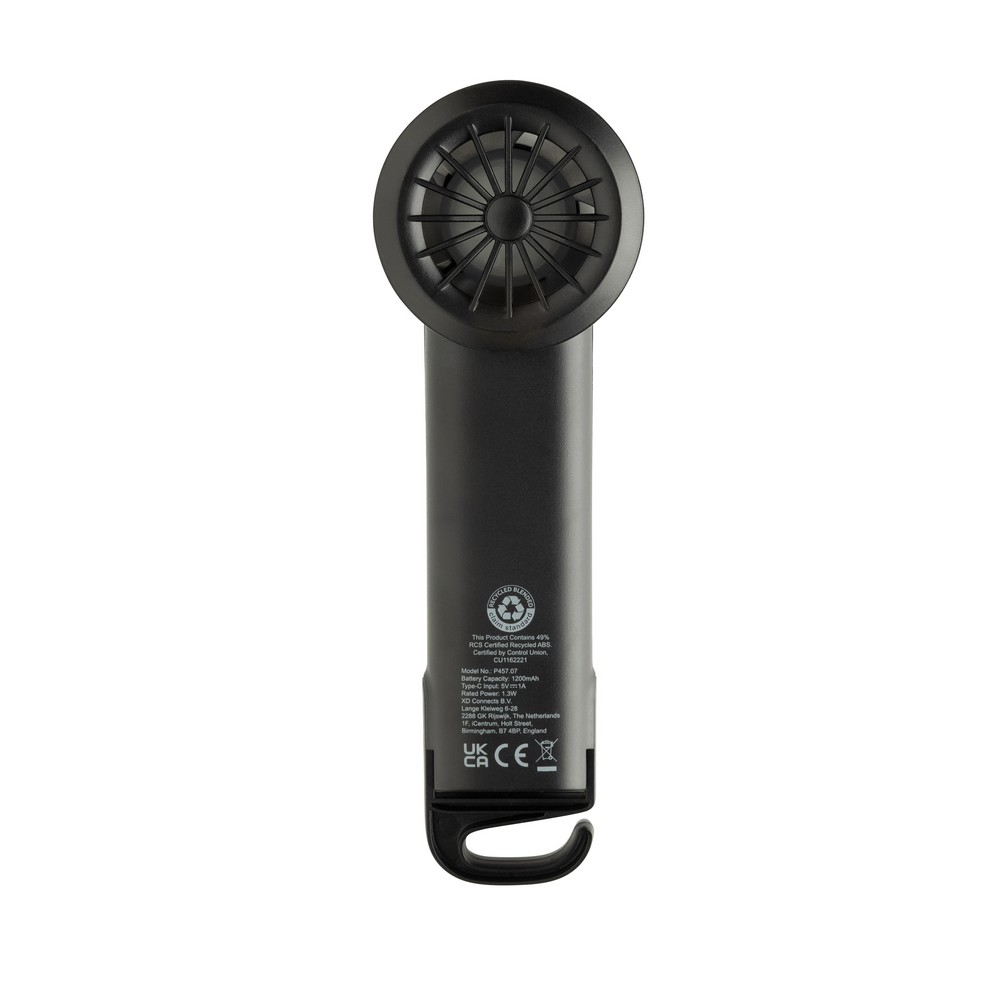 Wentylator kieszonkowy, wykonany z ABS z recyklingu, do 6 godzin działania na jednym ładowaniu, kabel w komplecie, całkowita zawartość materiałów z recyklingu obliczona na podstawie masy całkowitej produktu: 35%