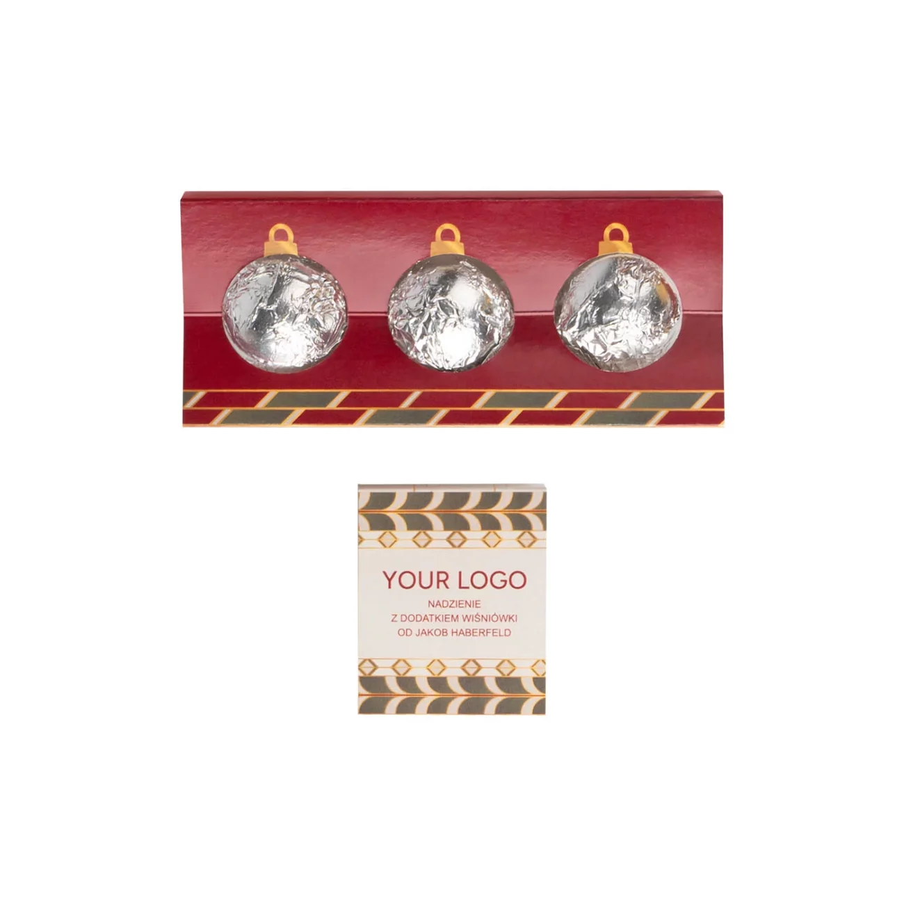 Zestaw 3 czekoladowych pralin (36 g) z nadzieniem wiśniówkowym od Jakob Haberfeld to elegancki i smaczny upominek. Mleczna czekolada 33% kakao, personalizacja cyfrowa na pudełku (biały, kraft lub ecru), srebrna folia – połączenie wyrafinowanego smaku, stylu i ekologii, idealny dla klientów, pracowników i partnerów biznesowych.