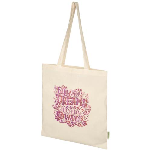 Torba na zakupy wykonana w 100% z certyfikowanej przez OCS bawełny organicznej o gramaturze 100 g/m² pochodzącej z Indii, wyposażona w dużą otwartą komorę główną, zapewniającą dużo miejsca na wszystkie niezbędne przedmioty. Uchwyty o długości 32 cm sprawiają, że można ją łatwo i wygodnie przenosić, gdziekolwiek się udasz. Nośność do 5 kg. Pojemność: 7 litrów.