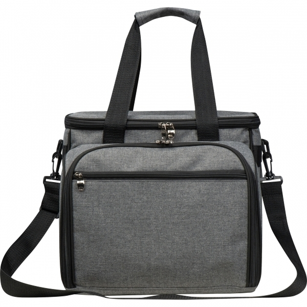 Elegancka reklamowa torba termiczna z nadrukiem z wygodnym paskiem na ramię, komorą chłodzącą i zestawem sztućców oraz talerzy dla 4 osób. Idealna jako gadżet reklamowy na piknik, plażę i lato, praktyczny i estetyczny prezent dla klientów, pracowników oraz firm, łączący funkcjonalność z promocją marki.
