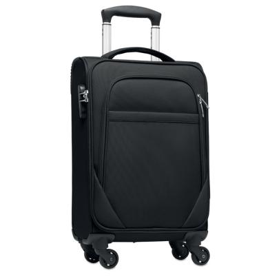Kabinowa walizka na kółkach 600D RPET poliester, miękka. Zewnętrzna komora na laptopa zapinana na zamek. Przednia kieszeń zapinana na zamek. Podwójna rama. 210D podszewka RPET i detale z PU.