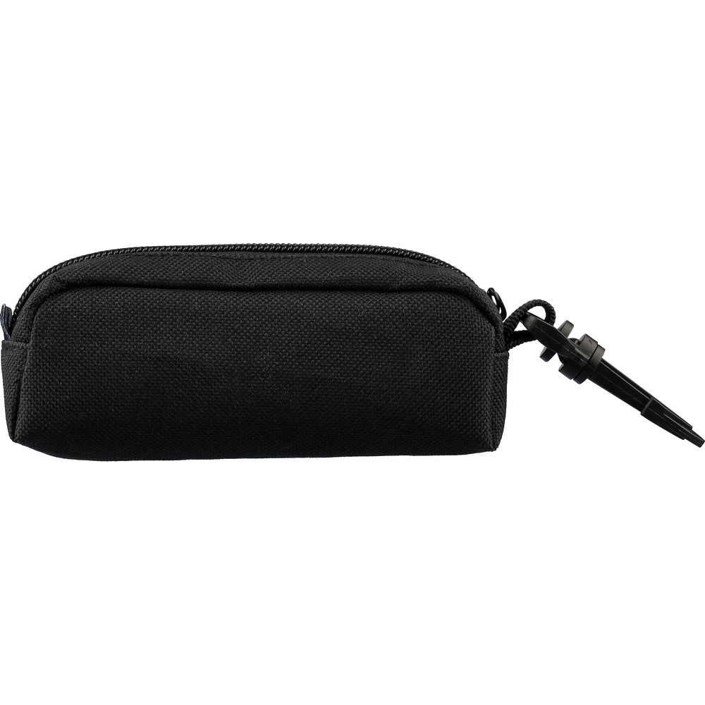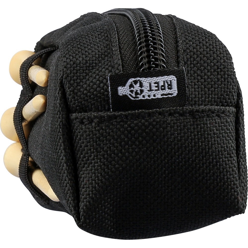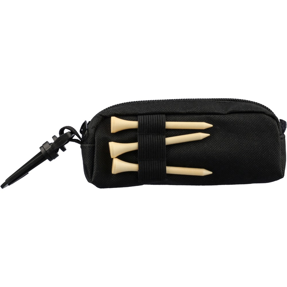Zestaw piłeczek do golfa zawiera 3 piłeczki golfowe, saszetkę z zamkiem i karabińczykiem, 3 drewniane kołki, ikona RPET na metce, produkt wykonany z RPET, PP i drewna bukowego